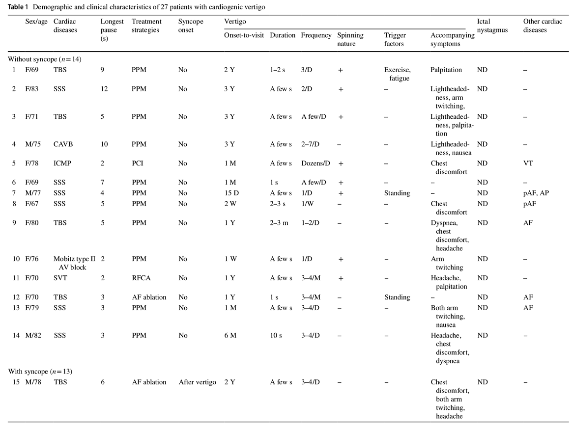 眩晕发作期间最常见的心脏异常是缓慢性心律失常(n = 24,89%)包括SSS(n = 9,33%),心动过速-心动过缓综合征(TBS,n = 7,26%)和完全房室传导阻滞 (CAVB,n = 6,22%)(表1)。这些患者中最长的停顿时间为2到23 s。CV的其他原因是缺血性心肌病(n = 2.7%)和室上性心动过速(n = 1、4%)。一些患者还有其他心脏疾病,包括房颤(n = 8,30%),心绞痛(n = 3、11%[2–29])和瓣膜性心脏病(n = 2,7%)。